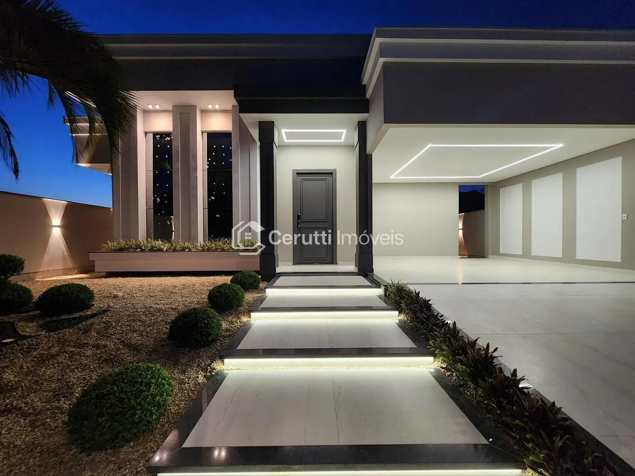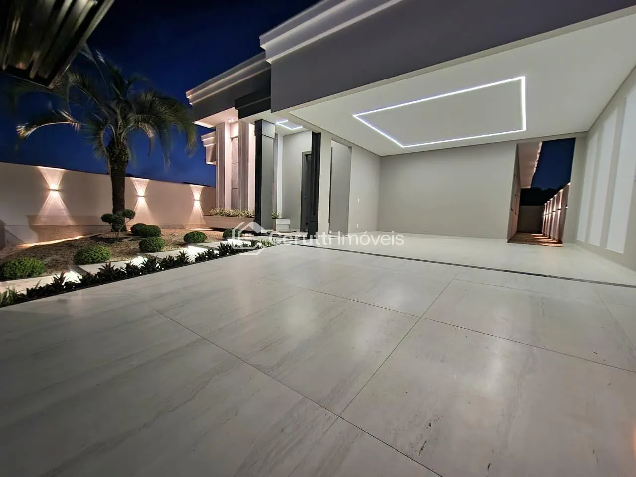 - Paisagismo Exuberante e Iluminado: Uma floreira deslumbrante, jardinagem completa e uma entrada magnífica com pisantes e iluminação em LED criam um convite visual impactante e acolhedor.